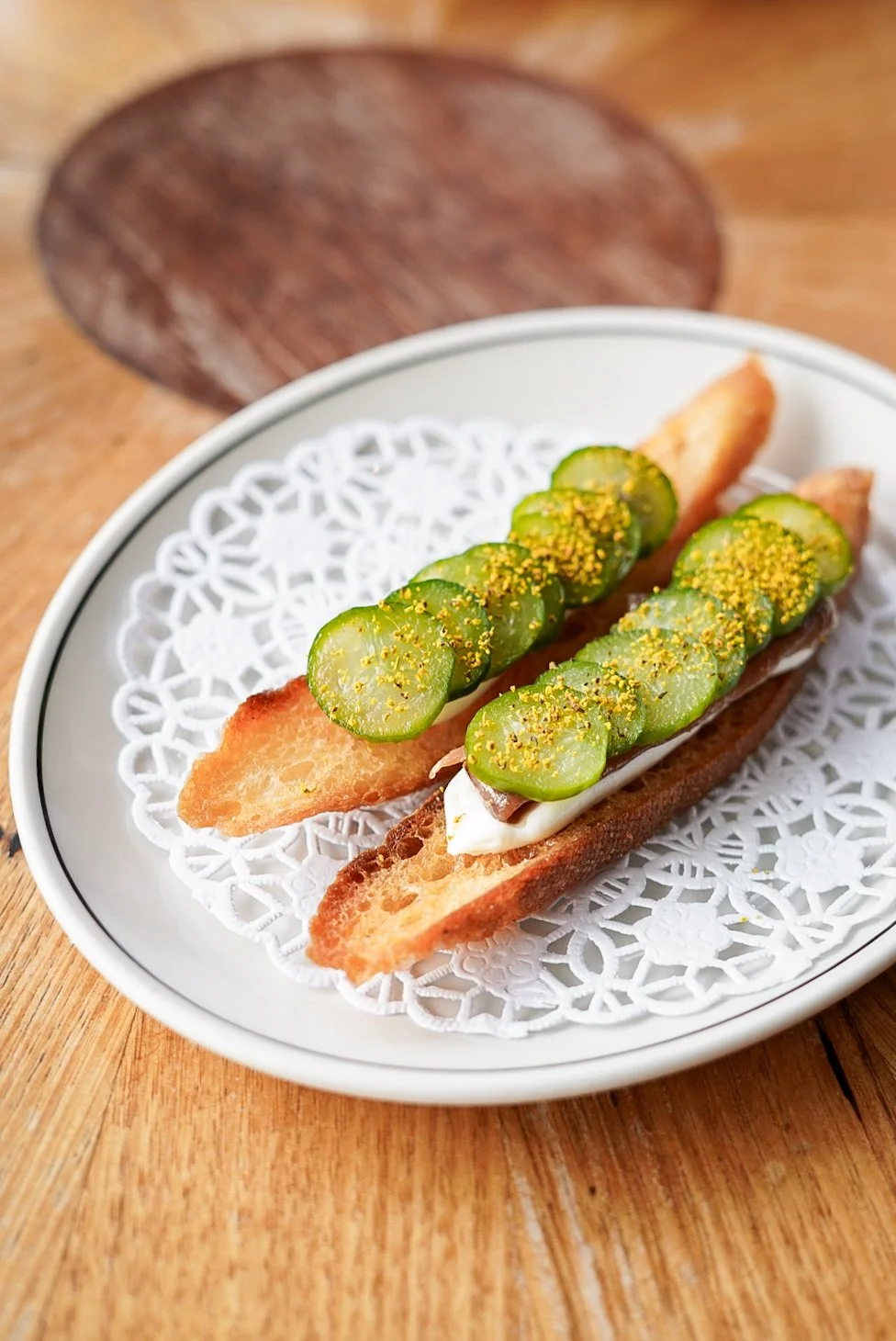 - Anchovy, fried bread, ricotta and pickled cucumber